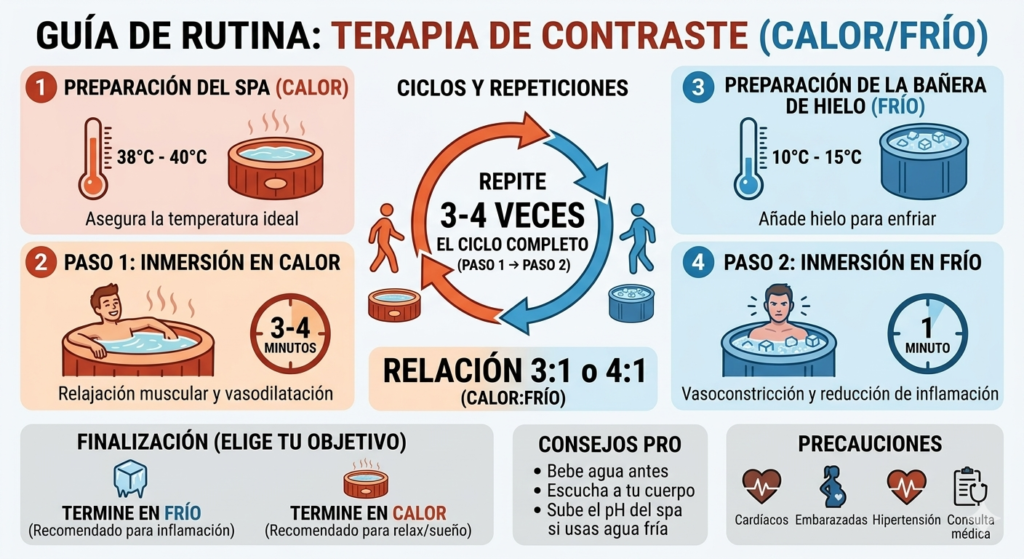 Esta es una rutina estándar diseñada para ser segura y efectiva. Necesitarás tener tu spa caliente y tu bañera de hielo listas simultáneamente.